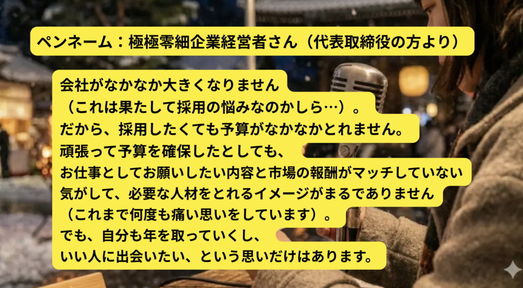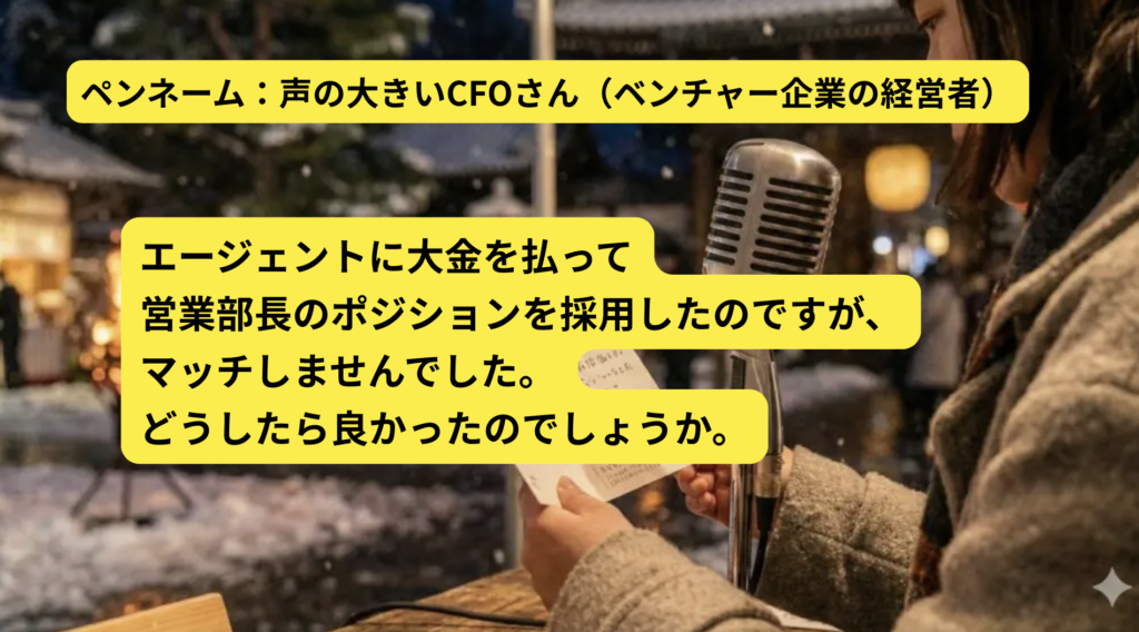 ひろ エージェントさんって、拡声器みたいなもので。自分たちがズレたお願いをしていると、それが拡声器みたいに大きく拡散されると思うんです。ズレた人が紹介された、ってことは、自分たちが曖昧なオーダーを出していたりしていないか?を一度みてみるといいと思うんです。