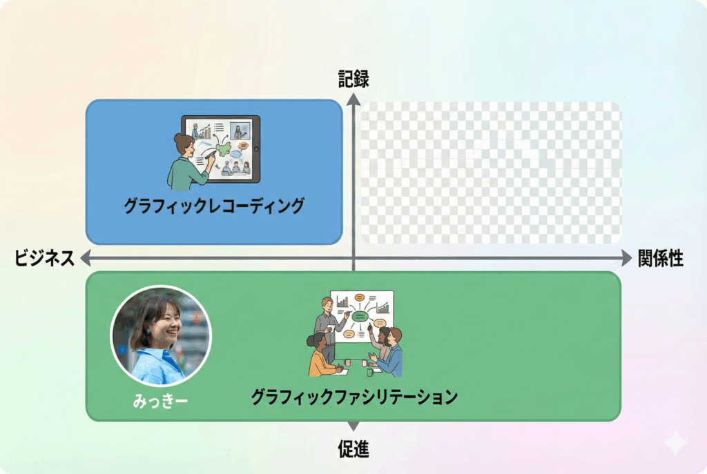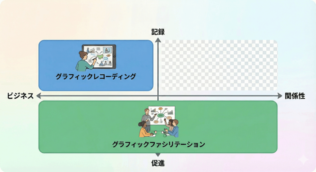 ・会議や対話を「見える化」するグラフィックレコーディング/ファシリテーションの違いを、ビジネス寄り・関係性寄りという地図で整理する。