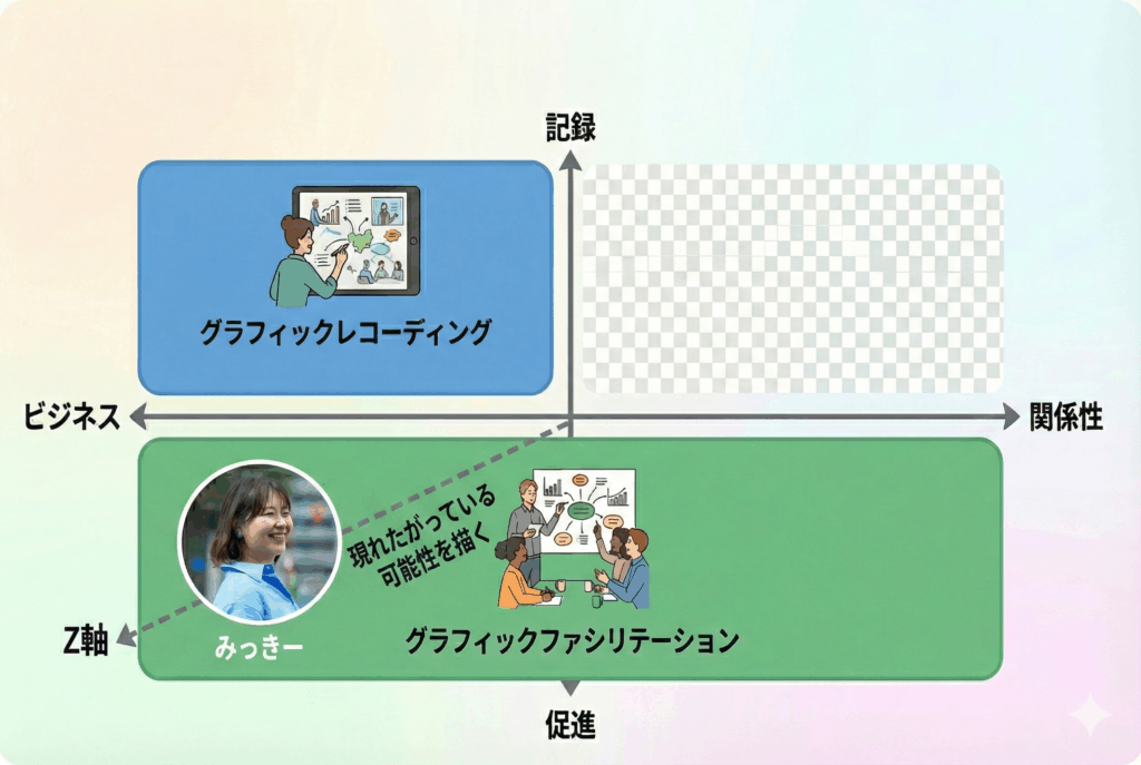 みっきー イマココラボのワークショップスペースで、2026年の1月から「Z軸グラフィックファシリテーション」の講座をスタートさせます。この講座は、私が持つ正解の型を教えるというよりは、エッセンスを共有することで、受講した人一人ひとりの個性や、その人らしいスタイルが表現されることを意図しています。