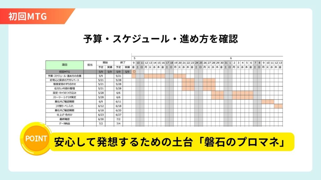 みっきー しかし、ただ対話に時間を割くだけでは「本題は?」と不安になりますよね。だからこそ、発想を飛ばす前に、通常の予算、スケジュール、進め方をしっかりと確認するパートを冒頭20分間でやりました。一見無駄かもしれない話をするには、盤石としたプロジェクトマネジメント(プロマネ)があって初めて、みんなが安心して飛べるんです。