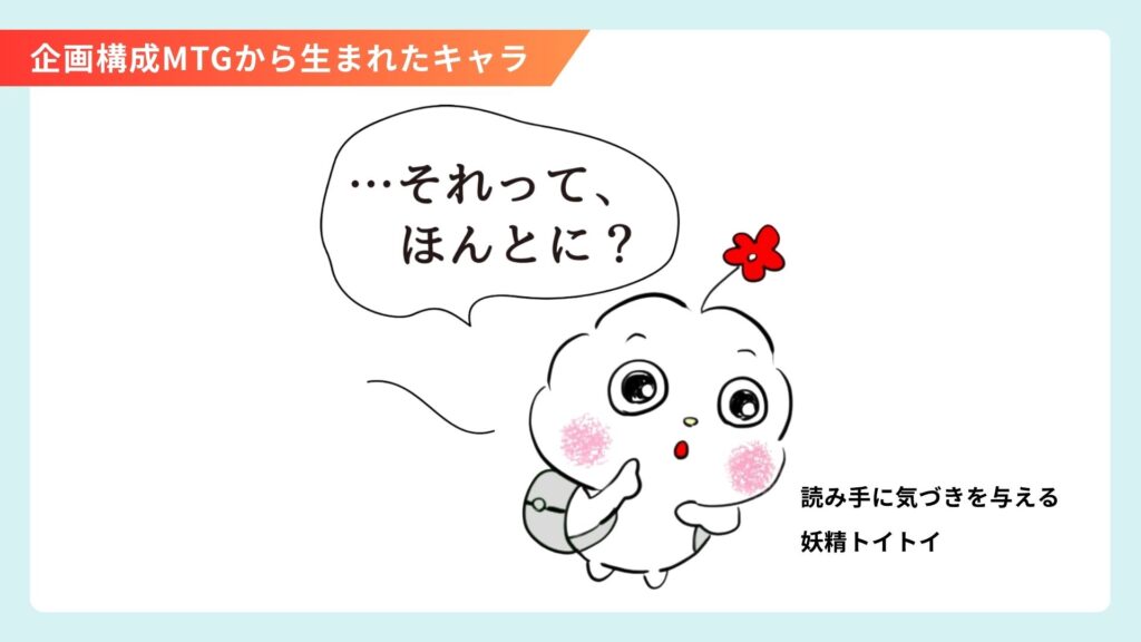 アイデアを出し合う中で、「コジコジのようなキャラクターが、本質的な問いをポッとつぶやくのとか、どう?」「それだ!」となって。読み手に気づきを与える妖精「トイトイ」(冊子の中の漫画に登場するキャラクター)の誕生につながりました。