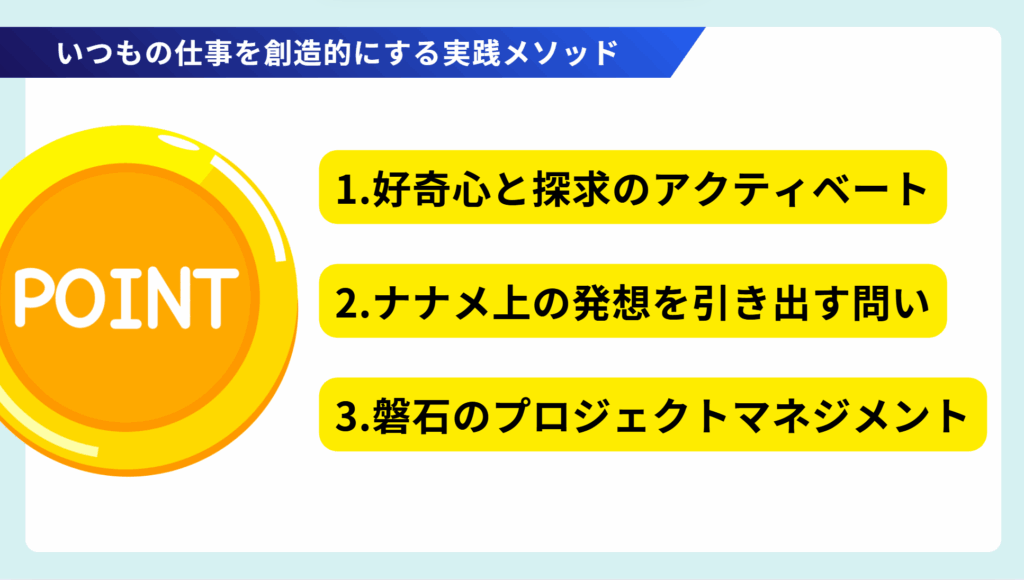 ・どんな仕事にも取り入れられる「目の前の仕事を創造的に変える3つの実践メソッド」と、体験セッションの案内をまとめています。
