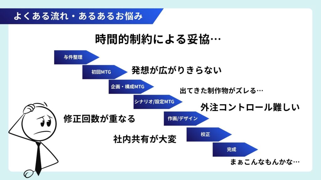 しかし時間的制約があると、発想が広がらない、外注(制作会社)との意図がずれる、修正回数が重なる、社内共有も大変になる、といった「あるあるお悩み」が発生しがちです。